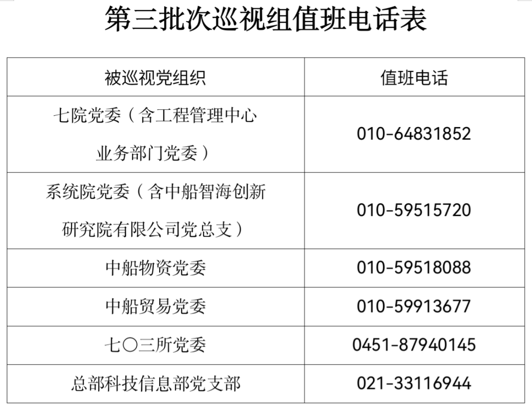 巡視期間,集團公司黨組巡視組設(shè)置值班電話和聯(lián)系信箱,主要受理反映被巡視黨組織領(lǐng)導班子及其成員、下一級黨組織領(lǐng)導班子主要負責人和重點崗位領(lǐng)導干部問題的來信、來電、來訪,重點關(guān)注違反政治紀律、組織紀律、廉潔紀律、群眾紀律、工作紀律、生活紀律以及巡視整改等方面問題反映。第三批次巡視受理信訪截止時間為9月22日。