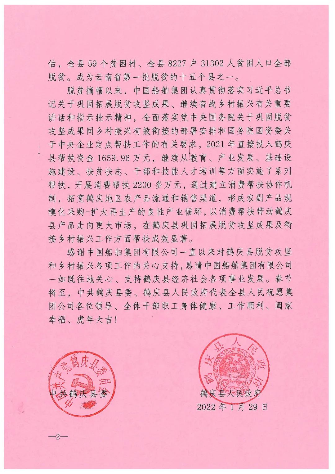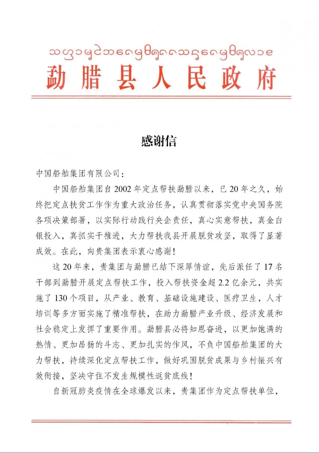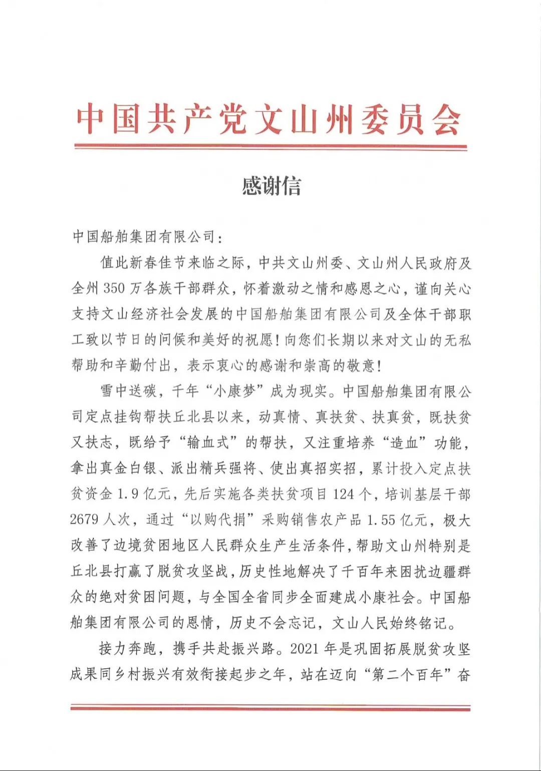 春節(jié)前夕,中國(guó)船舶集團(tuán)陸續(xù)收到云南省委省政府、文山州委州政府、鶴慶縣委縣政府、勐臘縣政府發(fā)來的感謝信,對(duì)集團(tuán)公司長(zhǎng)期以來給予鶴慶縣、勐臘縣、丘北縣的傾力幫扶表示衷心感謝和崇高敬意。